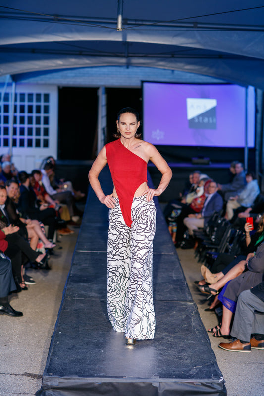 Women's Jumpsuit in red Tencel Lyocel Twill at the top and black and white custom print