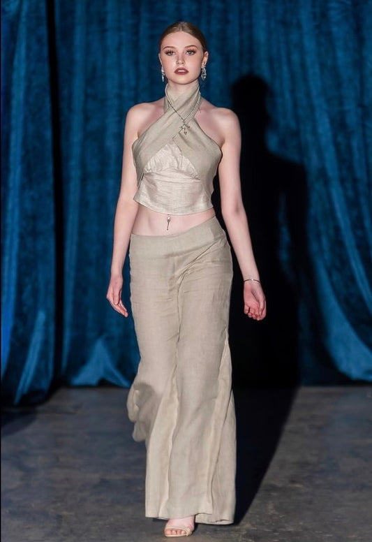 Unbound (Ádetos) is a sustainable fashion collection with a silhouette cut that emphasizes an under bust cleavage but more modest that a nude version. The sustainable fabrics used in this collection are Linen, Tencel Lyocell, and organic cotton. Ethically and sustainable made to order by fashion designer Renae Kotarski.
