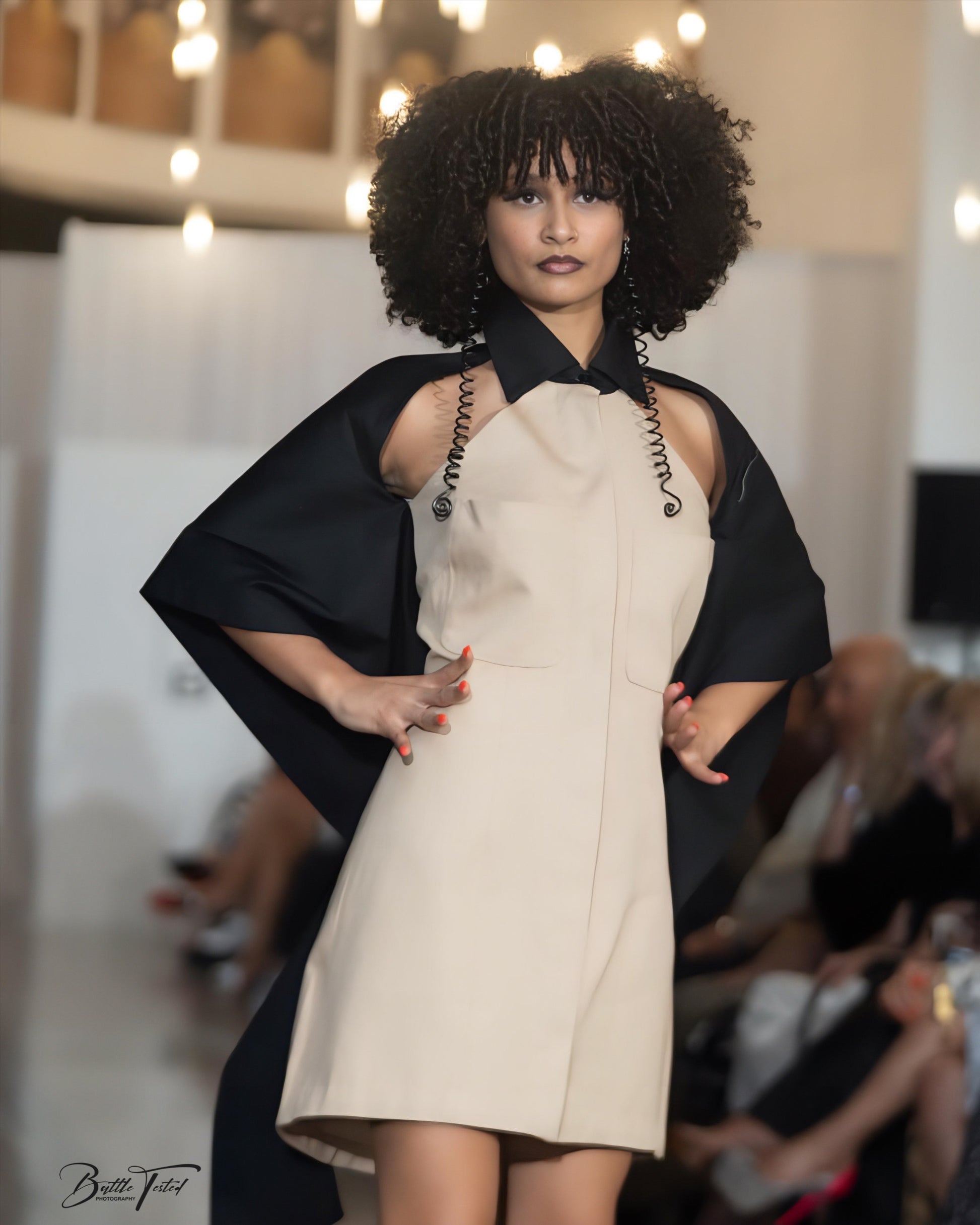 The Noirveil dress contrasts light and shadow — tan twill softened under a draped black cotton cape ruffle that drapes down the back and shifts with every motion.